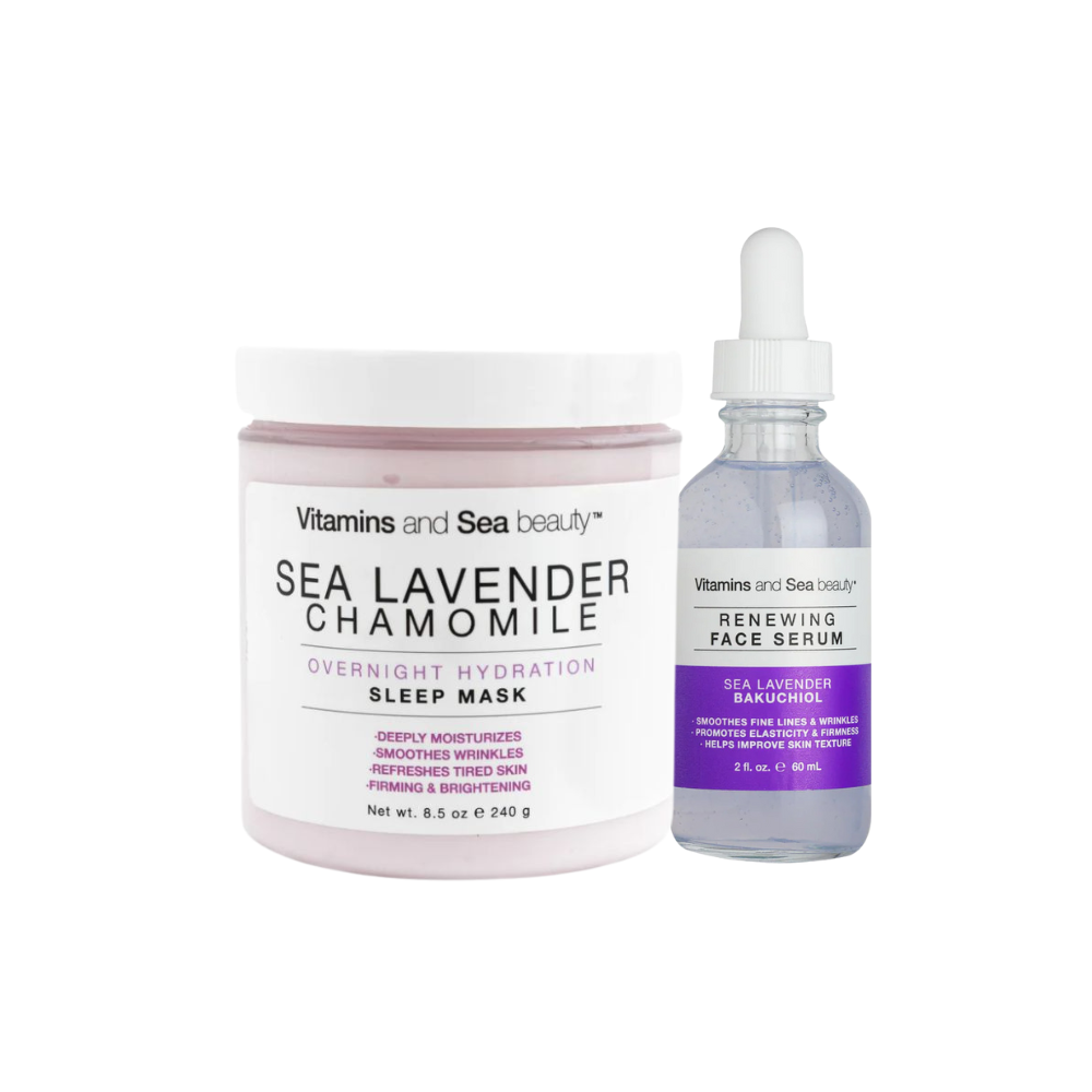 Set compuesto por una mascarilla hidratante nocturna con lavanda y camomila, y un serum de lavanda y bakuchiol que restauran la piel mientras duermes, dejándola suave y rejuvenecida al despertar.