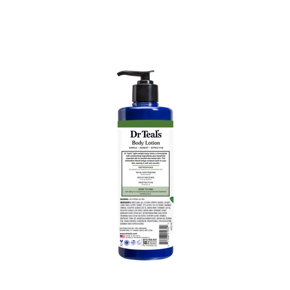 La loción corporal de eucalipto y hierbabuena del Dr Teal’s brinda una humectación profunda a la piel además de una aromaterapia rejuvenecedora. Esta rica mezcla de manteca de cacao, manteca de karité y vitamina E está impregnada de aceites esenciales estimulantes de eucalipto y menta verde para refrescar la piel y despejar la mente.
